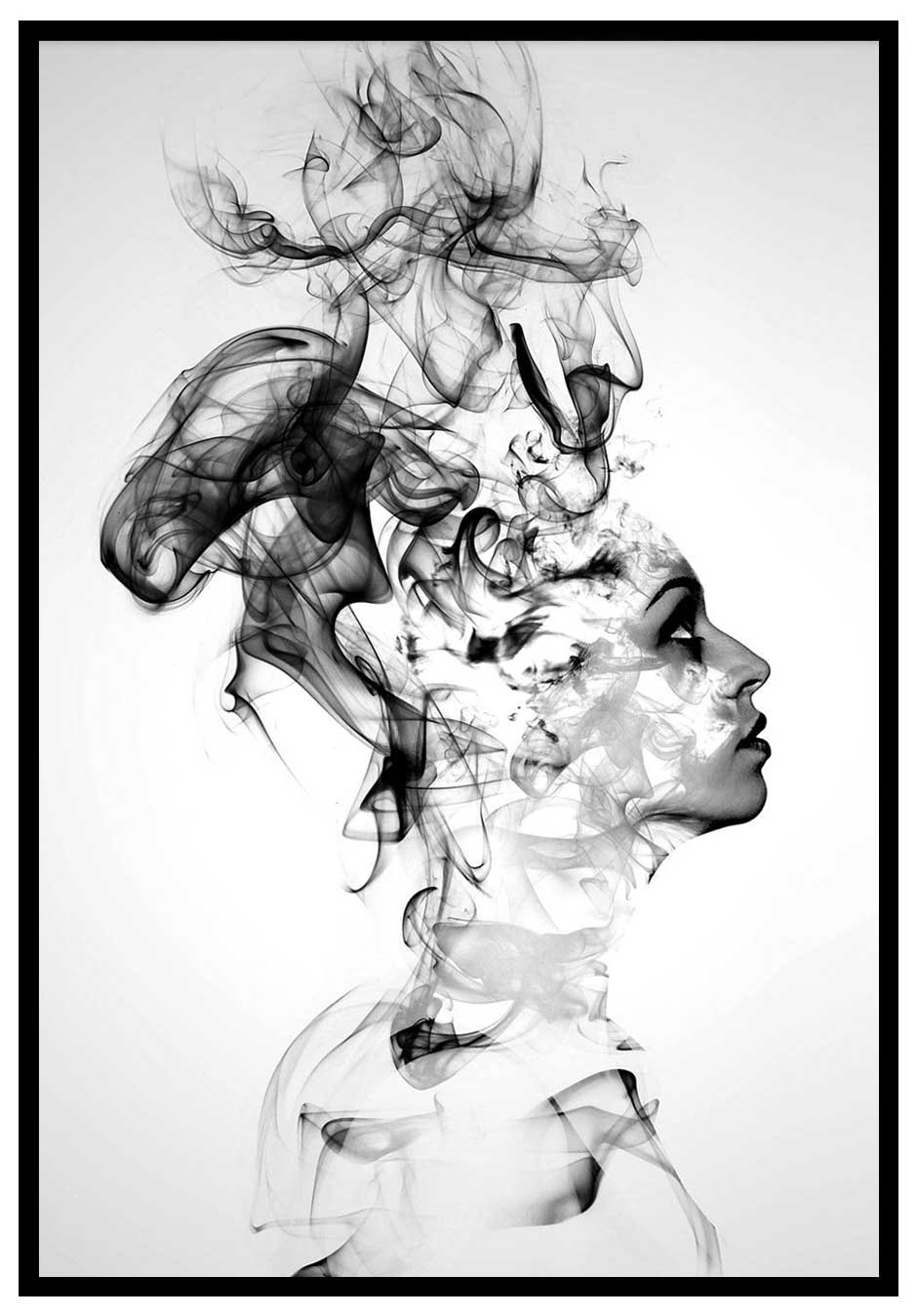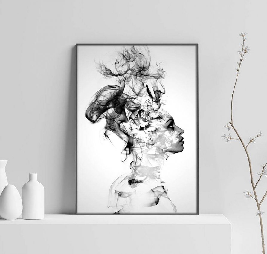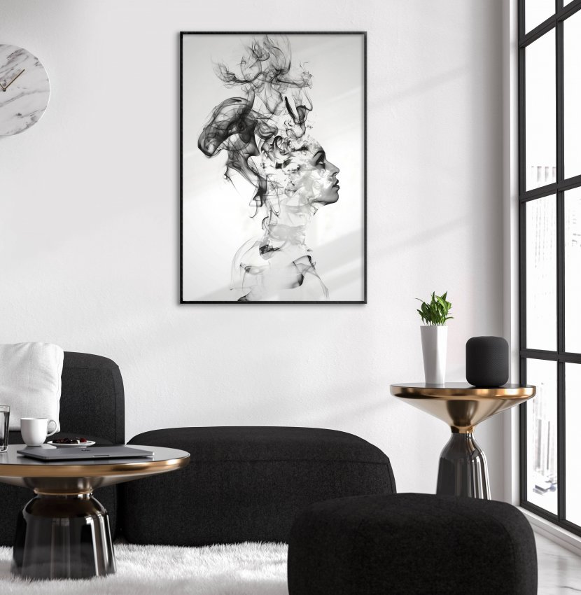 Unik affisch med svartvitt motiv på en kvinnas ansikte i profil som är grafiskt bearbetad på konstnärligt och abstrakt sätt så ansiktet formas till en sorts dimma eller rök. Snygg poster att ramas in bland andra svartvita posters och trendiga tavlor.