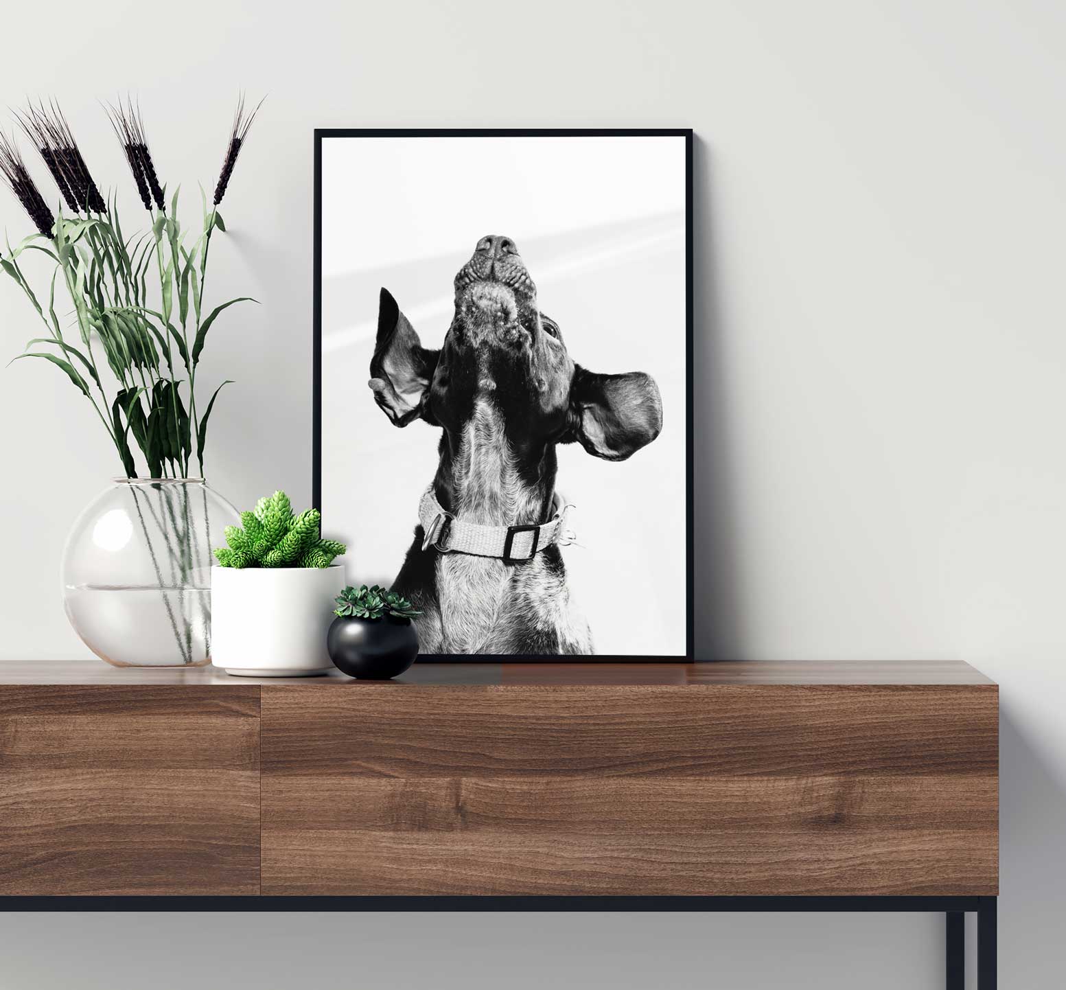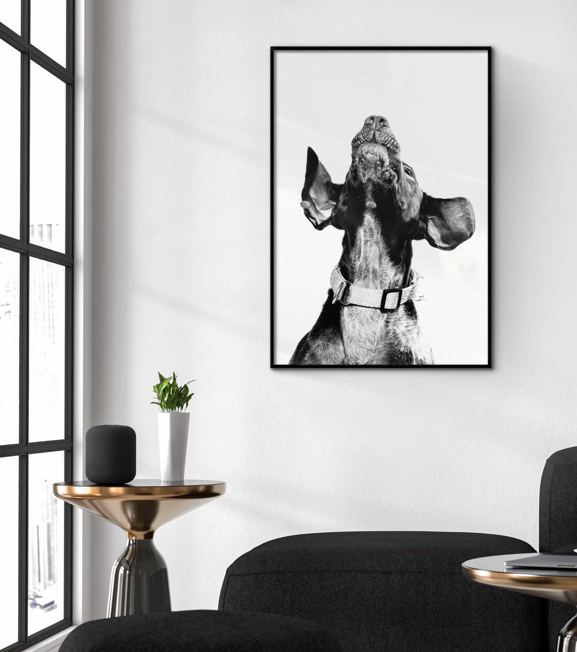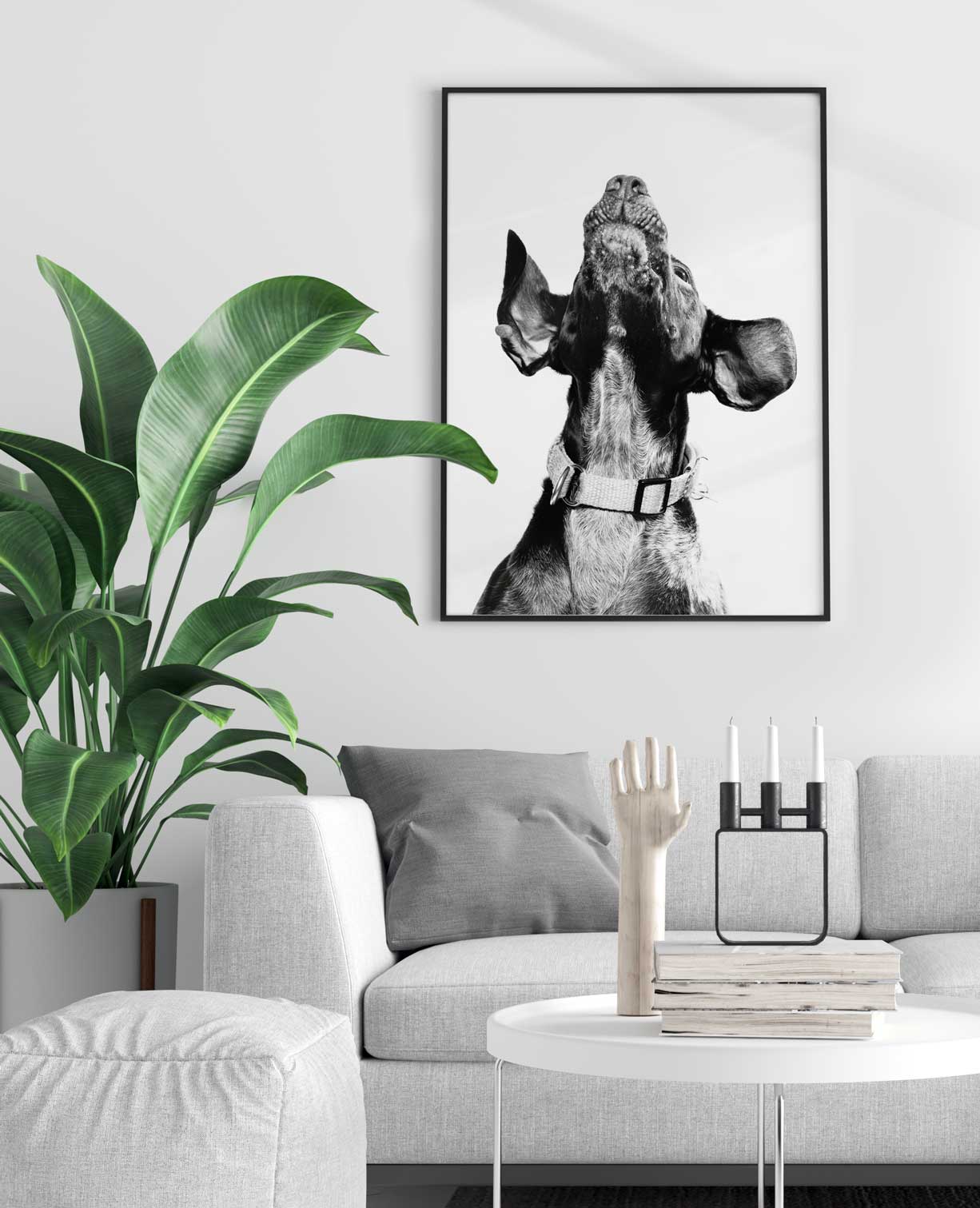 Snygg och abstrakt affisch i gråskala med hög kontrast och djurmotiv på en hund med stora öron som tittar upp i skyn. Motivet har vit bakgrund och matchar snyggt ihop med andra djurtavlor och bilder med vita bakgrunder.