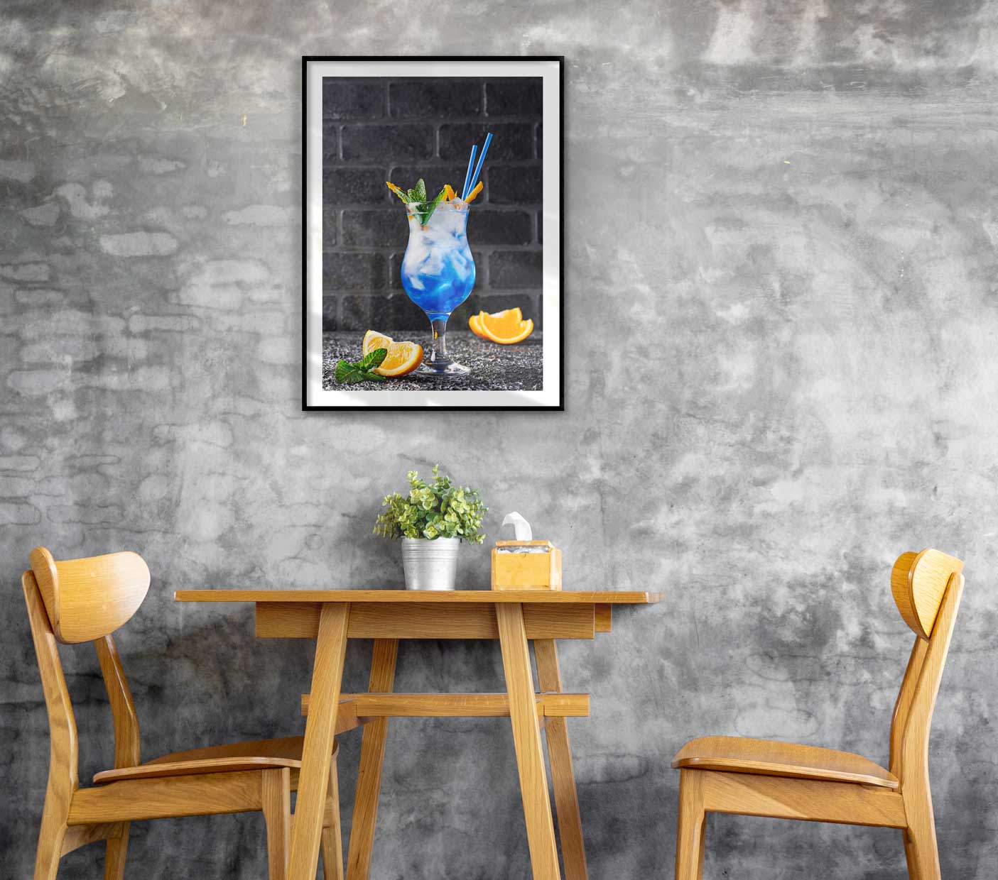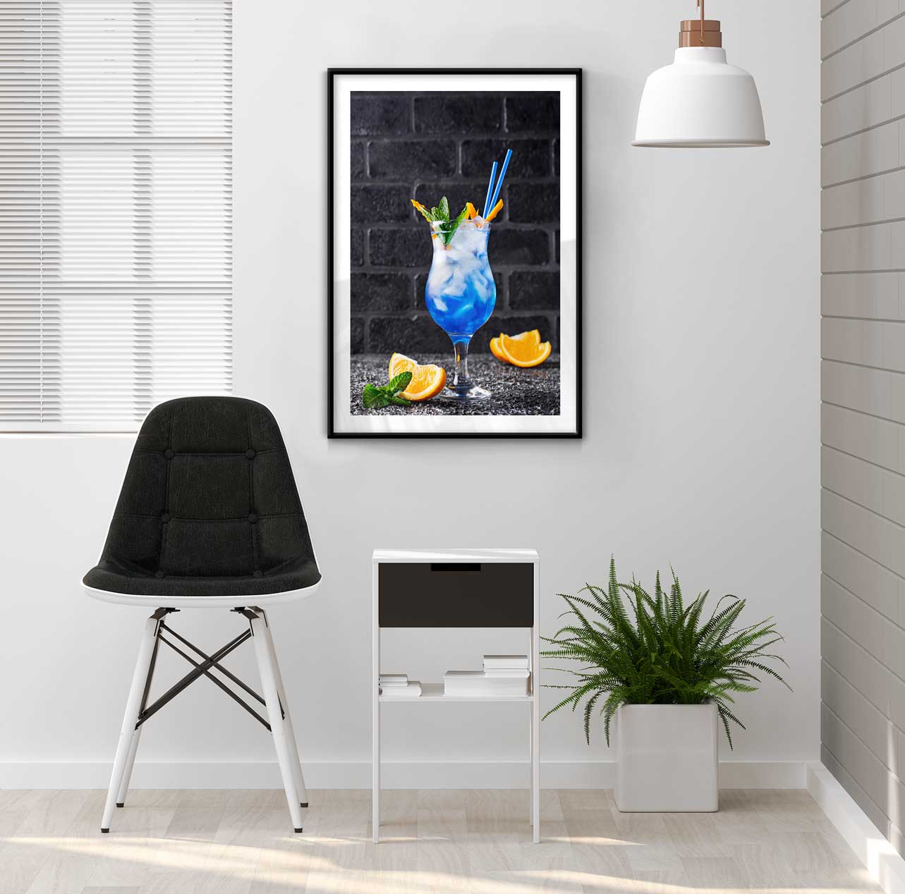 Unik poster i blått och gult med fotografi på en fin blå drink med sugrör och apelsinklyftor på bordet. Motivet har detaljer i färg med svartvit bakgrund och är försett med vita kanter runtom bilden. En snygg poster att ha i hemmabaren eller varför inte i en tavelvägg där du vill få in lite härliga färger?