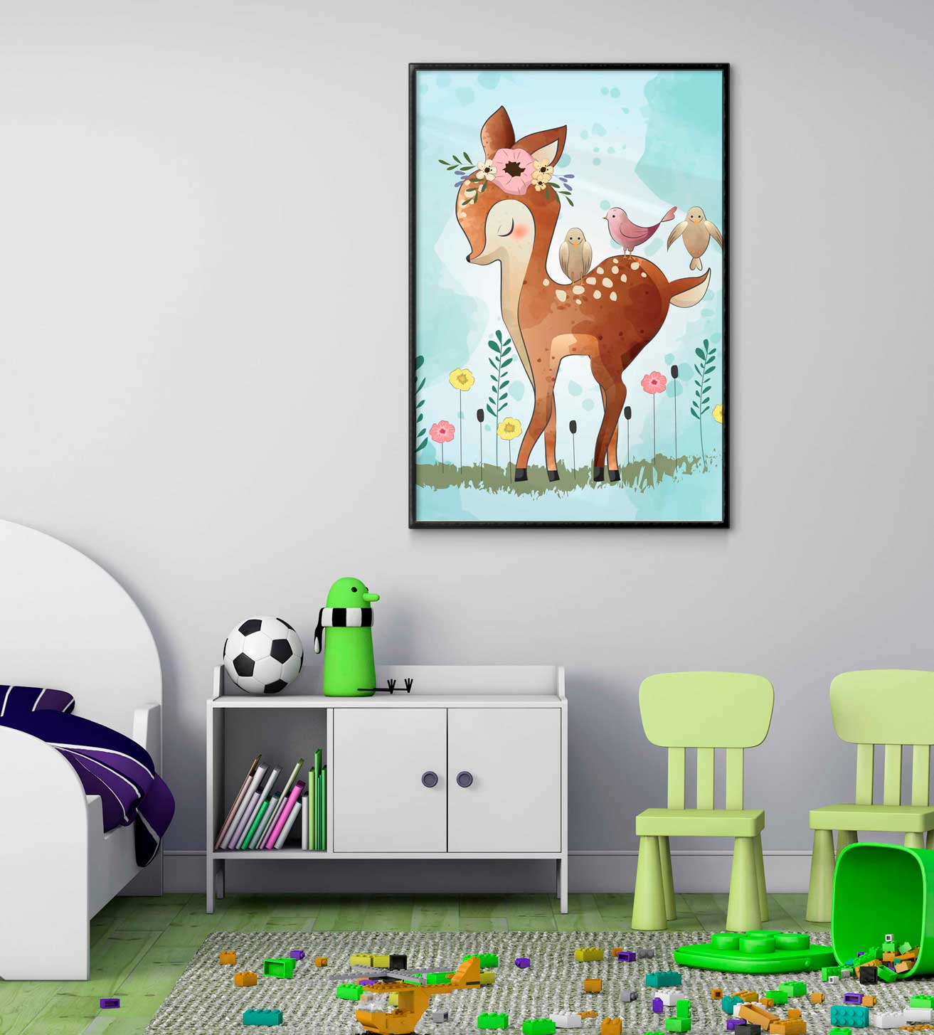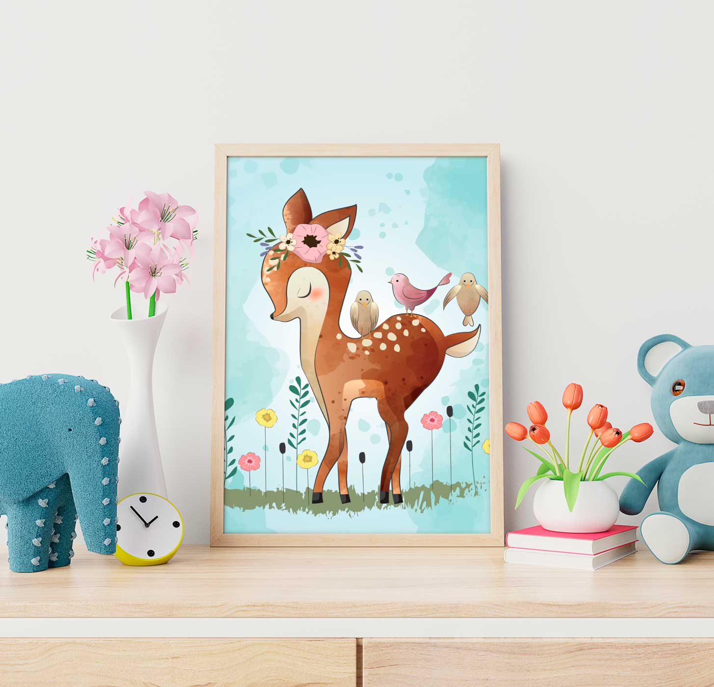 Tecknad barntavla med illustration av ett sött rådjur som vi döpt till Bambi. En färgstark och upplyftande affisch som passar att ramas in bland andra barntavlor i barnrum och babyrum för en harmonisk och varm miljö. Söta barntavlor med härliga färger uppskattas av alla barn och förgyller på alla sätt och vis.