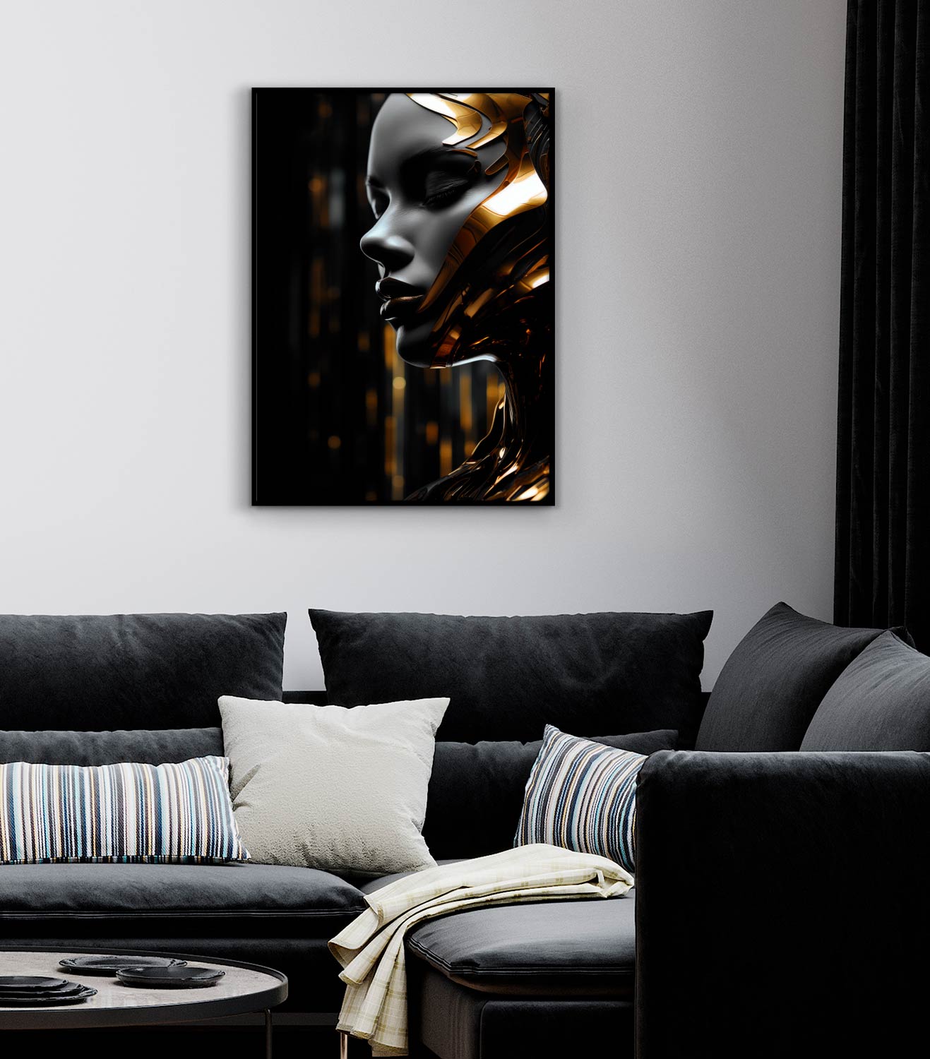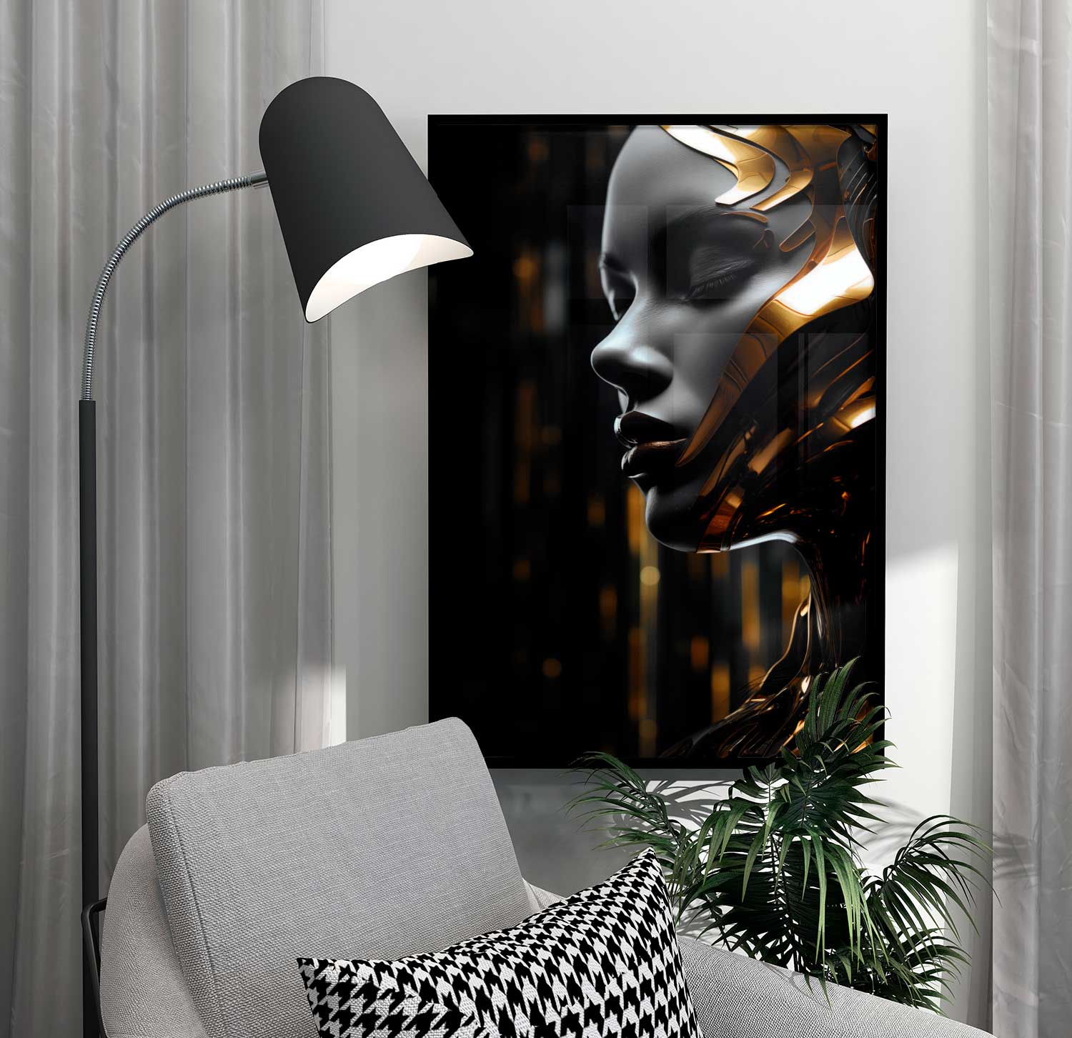 Förhöj din inredning med vår abstrakta poster som porträtterar en fashionabel kvinna i en förtrollande kombination av svart och guld. Denna konstnärliga skapelse är perfekt för dig som uppskattar unik väggdekoration och strävar efter en elegant atmosfär. Den guldiga och svarta färgpaletten ger en subtil touch av lyx och sofistikation till rummet, medan den abstrakta framställningen av kvinnan skapar en konstnärlig kontrast.