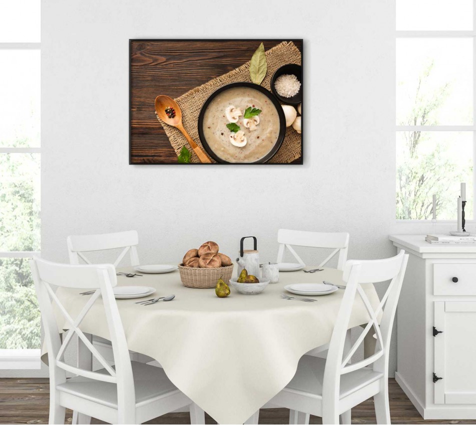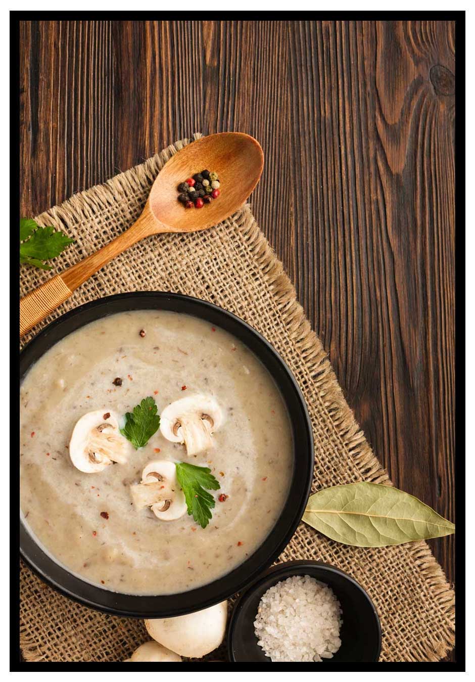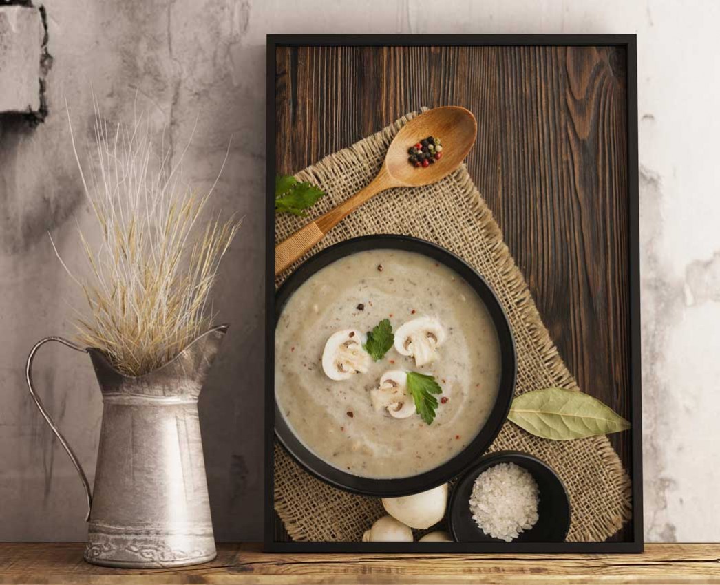 Elegant och tidlös kökstavla med brunt motiv av en skål med svampsoppa toppad med champinjoner. Snygg inredningsdetalj för köket och passar fint med annan inredning i bruna och orange färg.