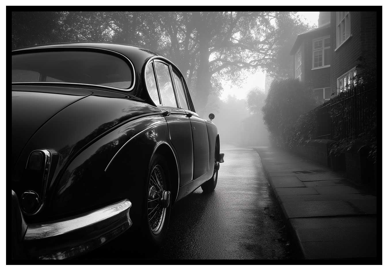 Den täta dimman och den våta gatan ger bilden en dramatisk och nästan filmisk känsla som för tankarna till klassiska brittiska filmer och vintagefotografi. Den svartvita färgskalan framhäver bilens eleganta linjer och förstärker motivets nostalgiska uttryck.