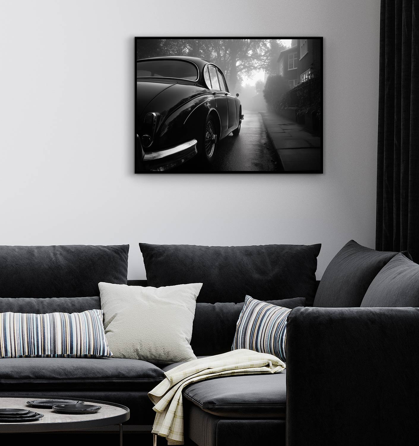 Fånga känslan av tidlös elegans och brittisk nostalgi med denna stilfulla svartvita poster i liggande format. Motivet visar en klassisk bil parkerad längs en lugn gata i London under det tidiga 1960-talet. Den blanka karossen speglar det mjuka ljuset från den dimmiga morgonen medan stadens historiska byggnader och träd skapar en atmosfär fylld av retro charm.