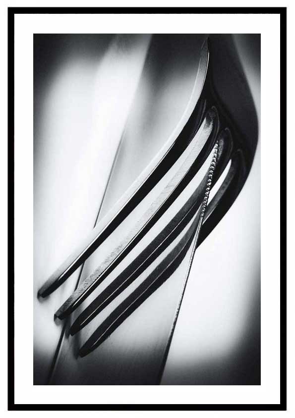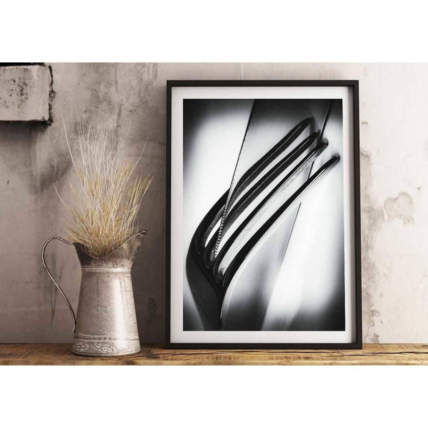 Elegant kökstavla med abstrakt fotografi i svartvitt och motiv av kniv och gaffel i närbild. En unik affisch som passar utmärkt som inramad fotokonst i köket bland andra tavlor i gråskala och med moderna, trendiga köksmotiv.