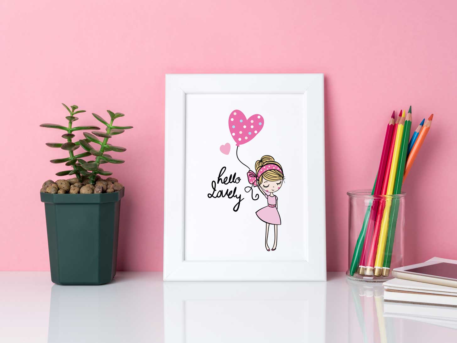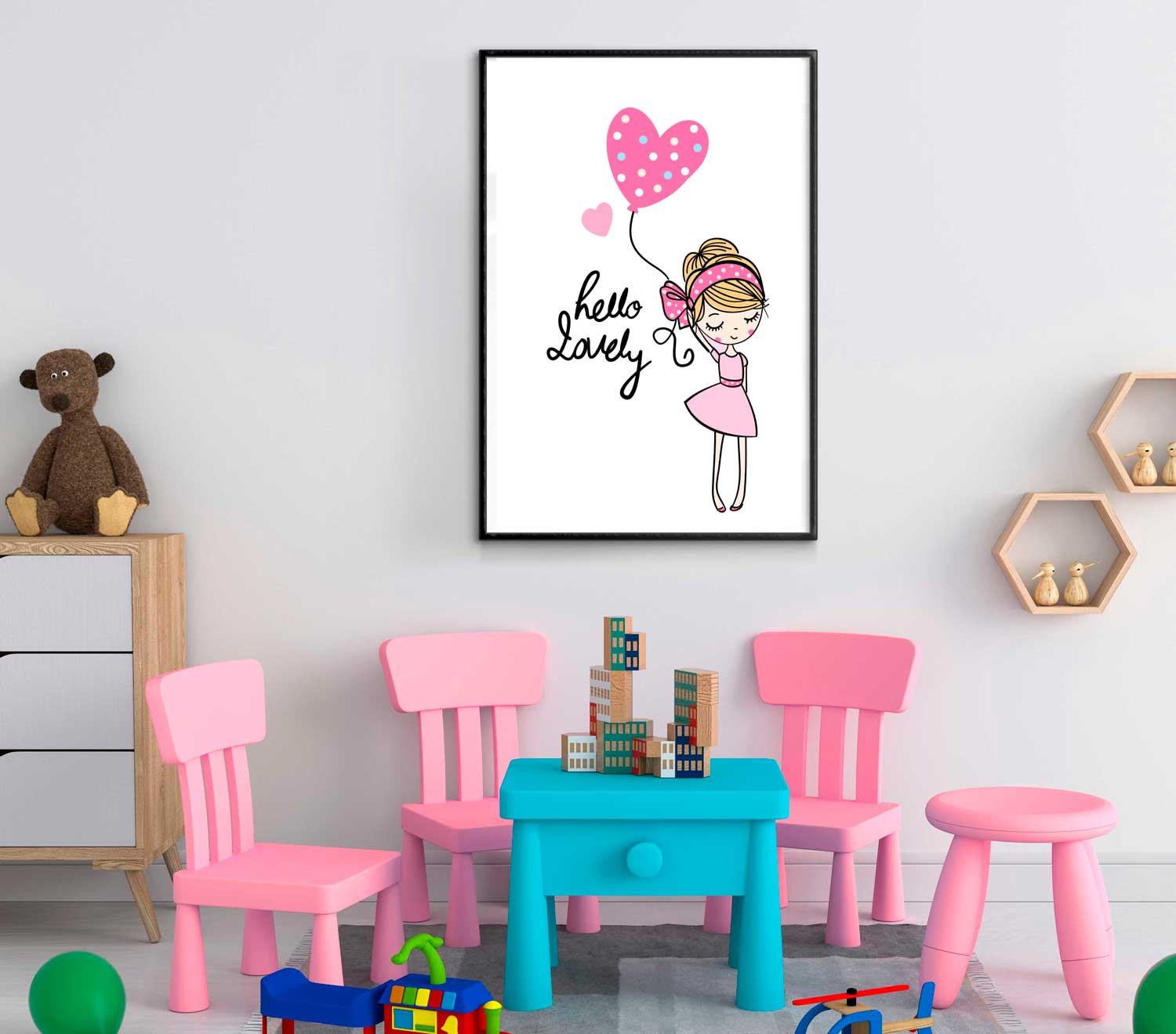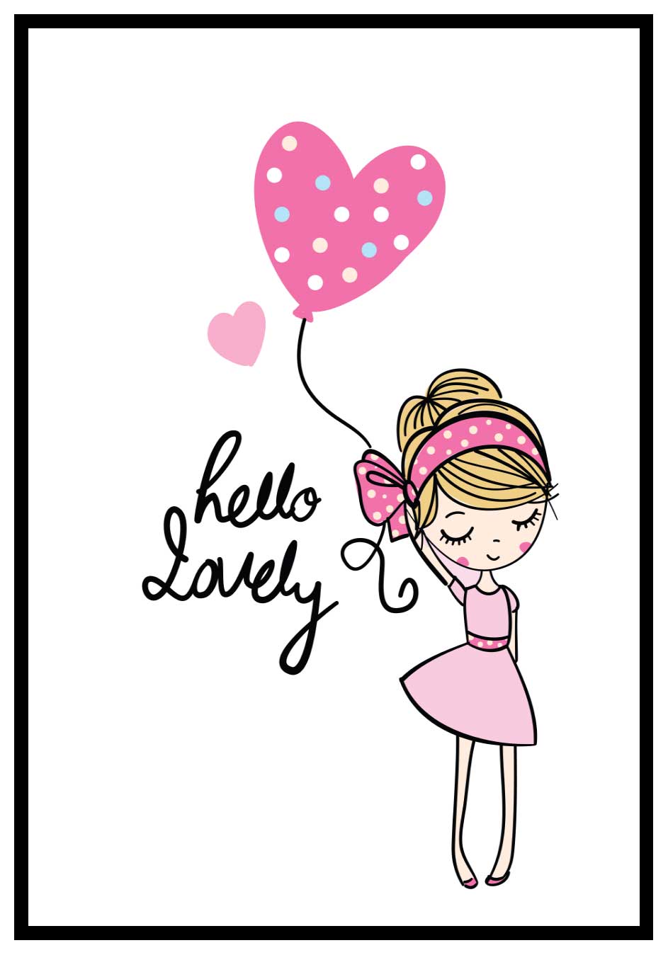 En ljusrosa barntavla med tecknad bild på en söt flicka som håller i en ballong formad som ett hjärta med engelska texten ”Hello lovely” som på svenska betyder ”Hej min kära”. En simpel och upplyftande barntavla som kan ramas in bland andra rosa barntavlor och enkla bilder och texter som förgyller hemmet och främst barnkammare och barnrum.