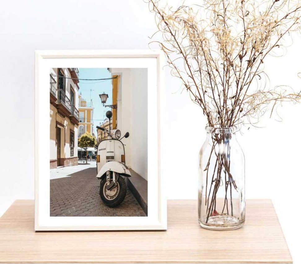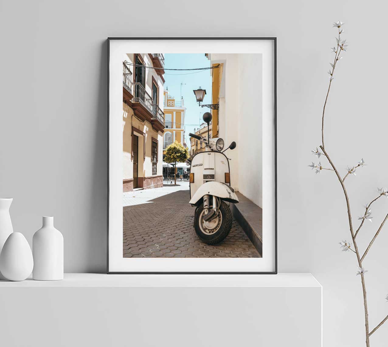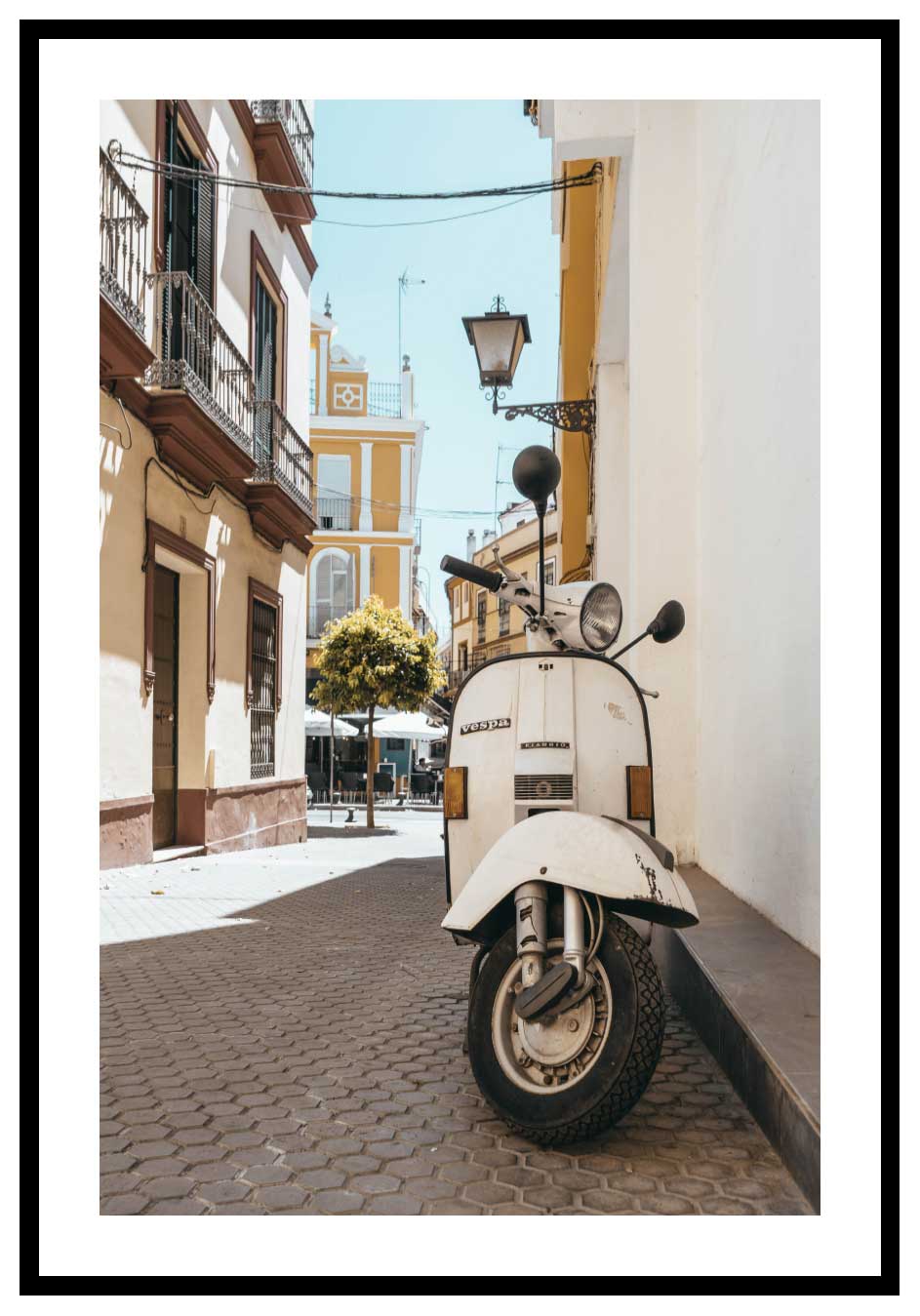 Fin poster med fotografi på en gammaldags Vespa moped som står på en fin gata i Europa med fina hus runtom och ljusblå himmel som ridå. Affischen är försedd med vita kanter som bidrar till elegans i motivet. Postern matchar snyggt ihop med andra retro och vintage tavlor i beige, brunt, orange och ljusblått.