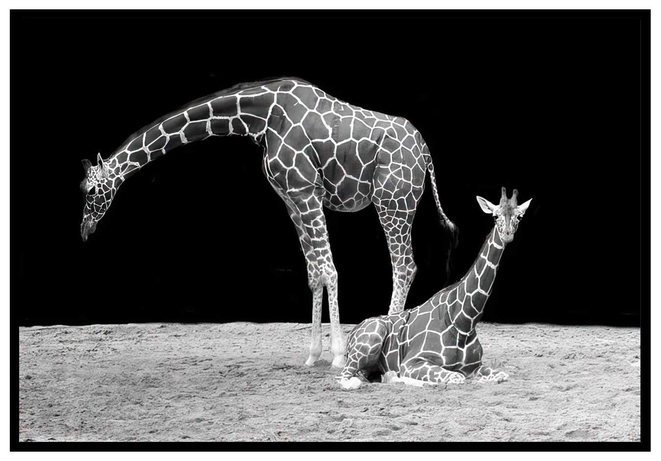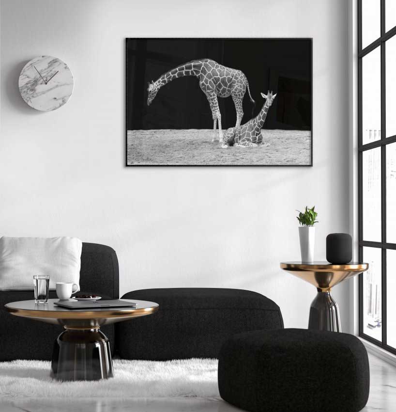 Unik djurposter med svartvitt fotografi i liggande läge med bild på ett par giraffer på savannen med totalmörker som ridå i bakgrunden. Utmärkt alternativ till väggdekoration i rum du inreder med svart och vitt. Matchar snyggt bland andra exotiska djurmotiv i gråskala.