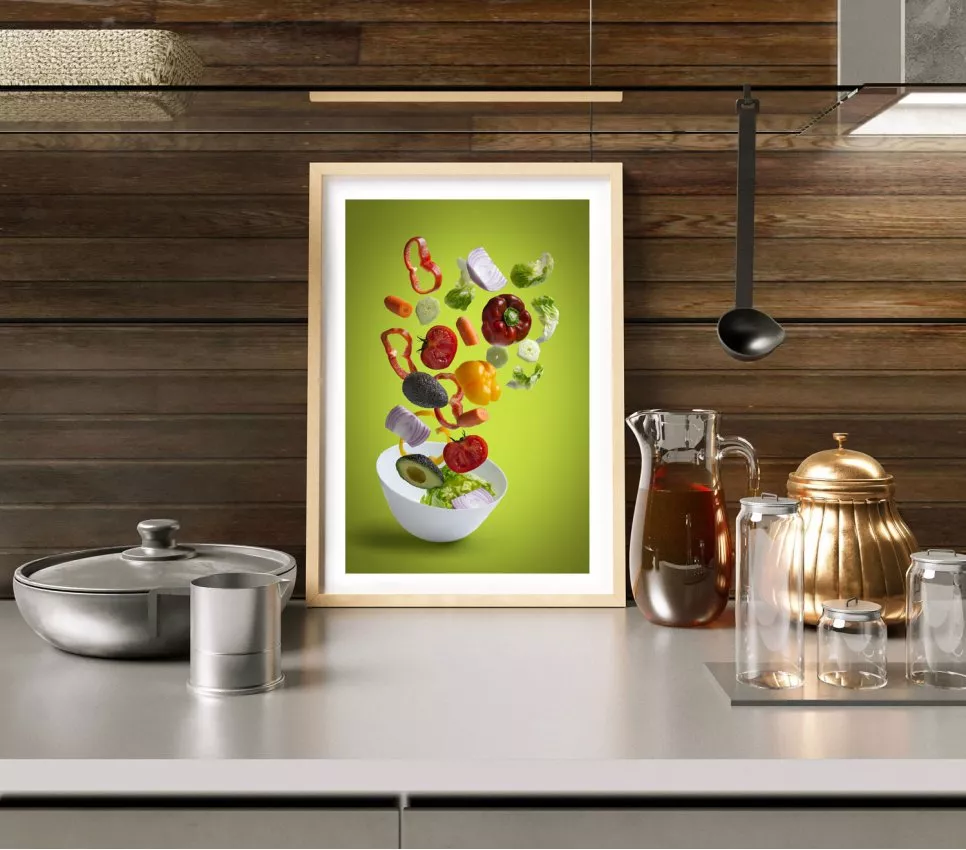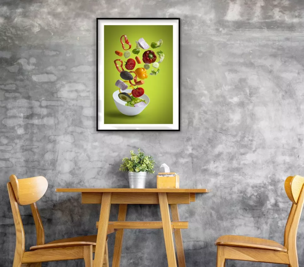 Unik tavla i limegrönt med bild på en skål med grönsaker som flyger ur upp i luften. I bilden finner vi b.la paprika, avokado, sallad, lök, tomat och morot. Perfekt mix för en grönsakssoppa? En snygg limegrön kökstavla att rama in i köket för att påminna sig om att äta nyttigt men också en trendig inredningsdetalj för kökets väggar om man vill få in lite härliga färger.