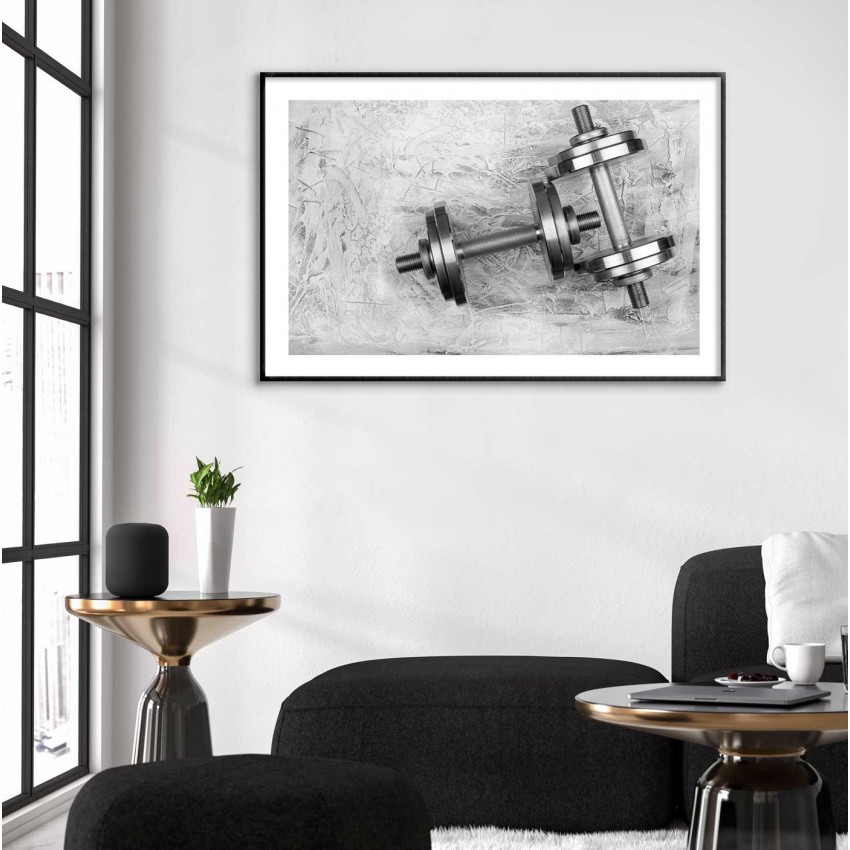 Poster i gråskala med bild på ett par hantlar i metall och retro bakgrund. En affisch med vit kant, i svartvitt och ett motiverande träningsmotiv som passar på väggen både hos dig som vill finna inspiration till att gå till gymmet men också hos dig som har ett öga för svartvit fotokonst.