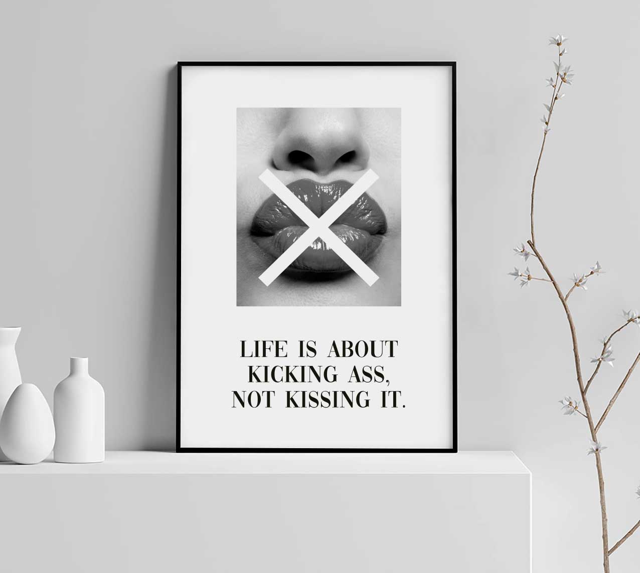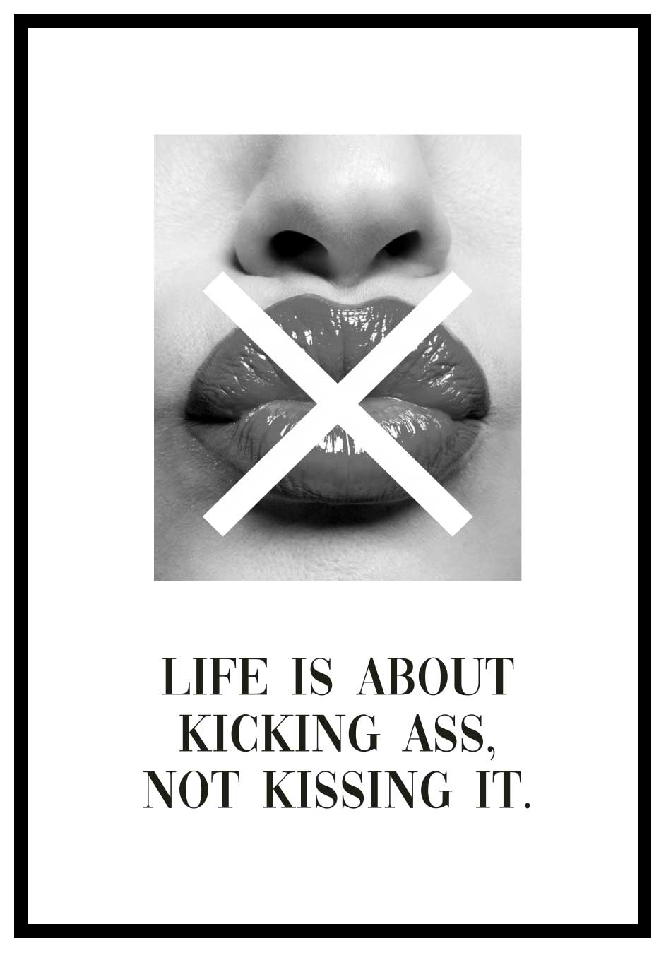 En textposter med texten ”Life is about kicking ass, not kissing it”. En affisch med trendig design och en påminnelse att inte bli överkörd av andra, och att tillåta sig göra sin egen grej. Bilden i affischen klargör budskapet tydligt med ett fotografi på en kvinnas kyssande läppar i närbild och ett kryss över.