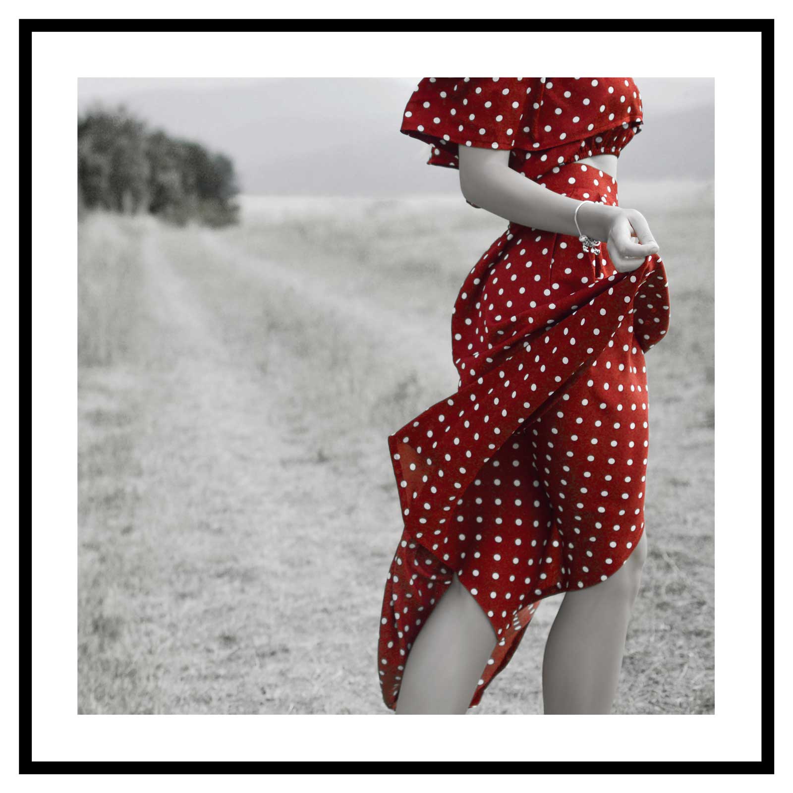 Kvinna i röd prickig klänning – Svartvit röd kvadratisk poster