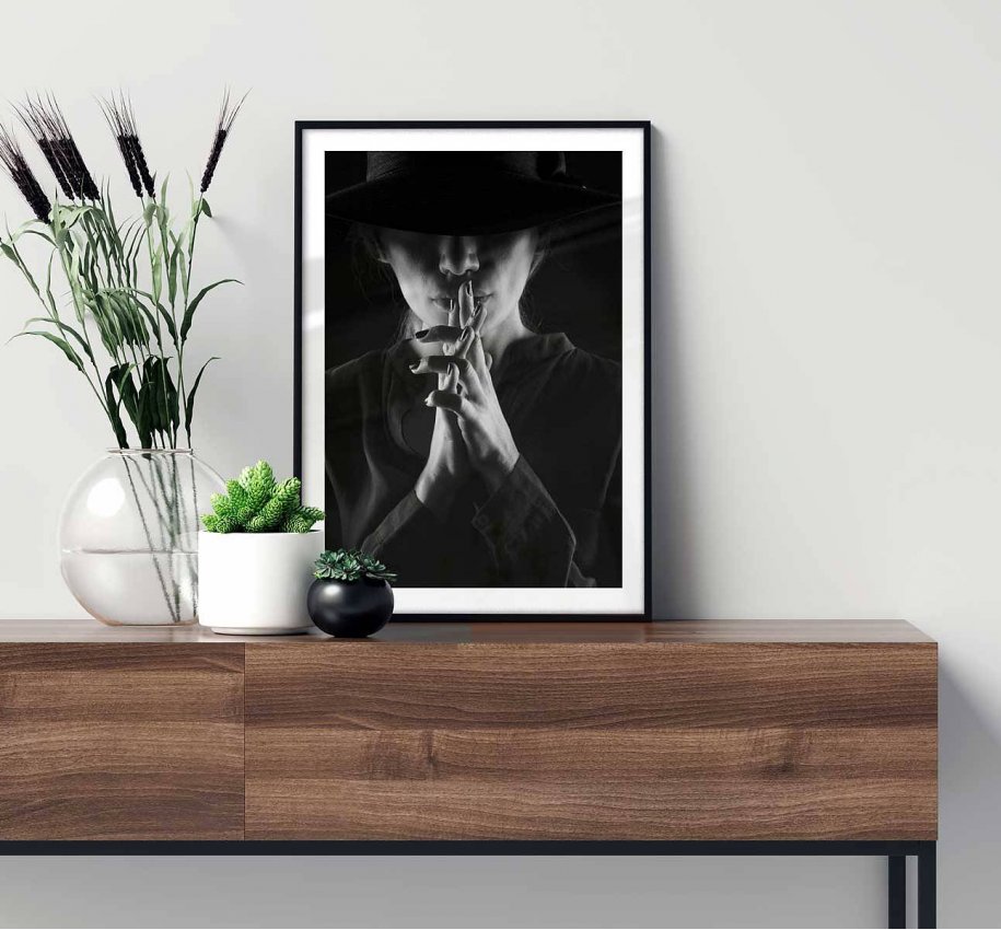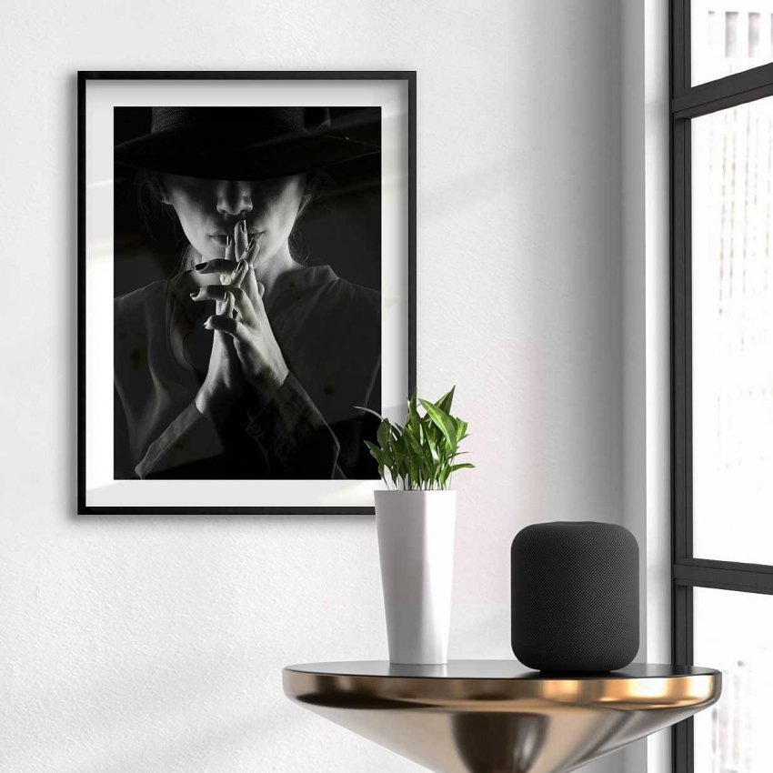 Snygg, svartvit poster med fotokonst och motiv på en kvinnas ansikte i mörker. Kvinnan bär hatt och ögonen skuggas vilket framhäver mystiken i bilden. Motivet är försedd med ”inbyggd” passepartout och matchar snyggt bland andra trendiga posters och prints på väggen.