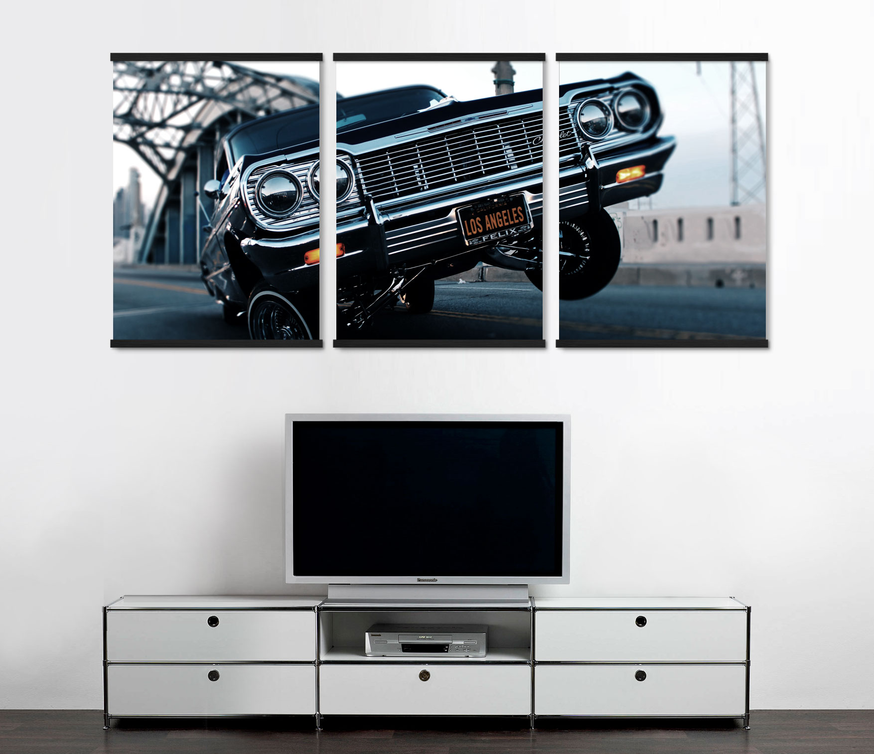 Snygg uppdelad tavla i tre delar med motiv av en bil, ”Amerikanare” med extrem hydraulik i hjulen. Perfekt uppsättning med posters i rum där du vill inreda med coola bilposters. Detta set med posters passar också bra som inredningsdetalj på väggen där du vill få en känsla av storstad, Hollywood och Los Angeles.