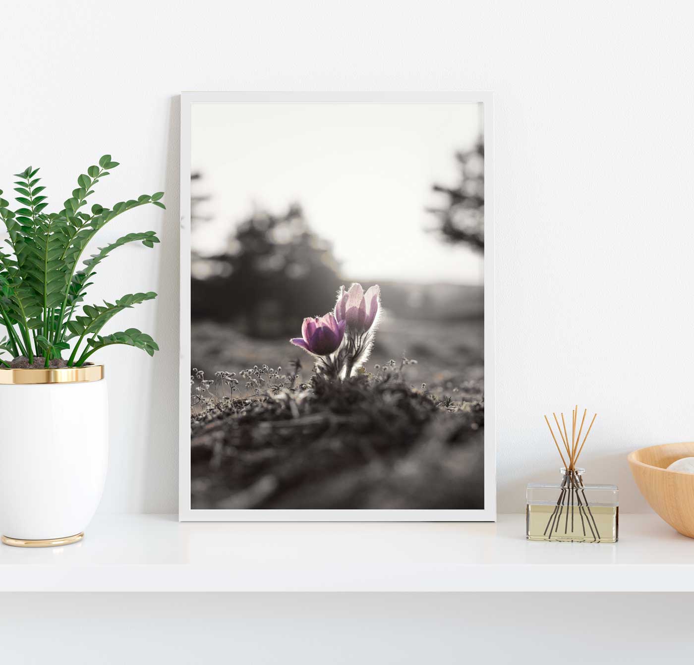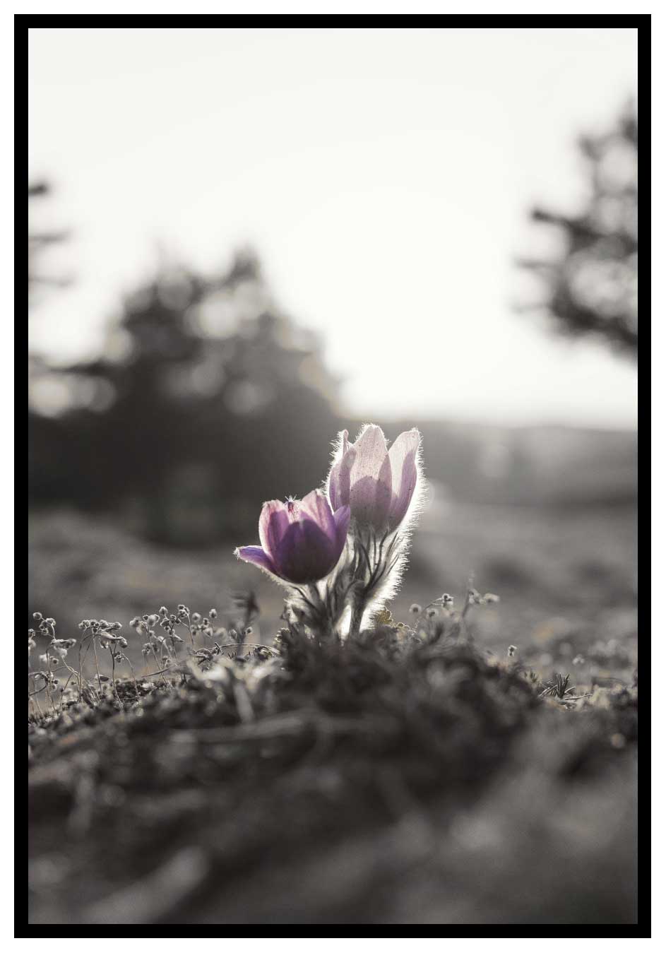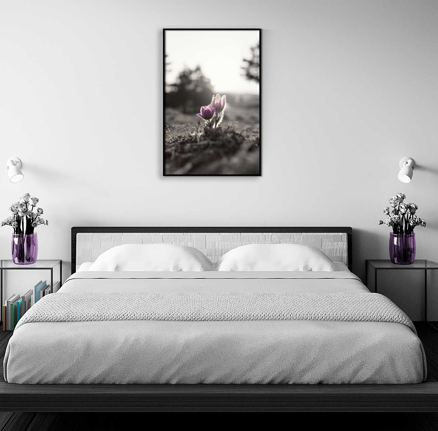 Snygg och originell affisch med lila blommotiv och övrig miljö i svartvitt. I bilden finns fokus på de lila blommorna med solljuset som glänser igenom. Ett originellt motiv som passar snyggt på väggen i rum där du vill få in lila färg och ändå behålla en stilfull och enkel inredning i gråskala.