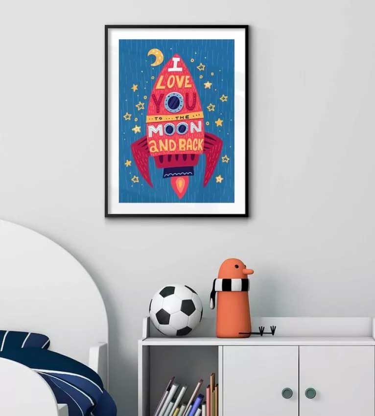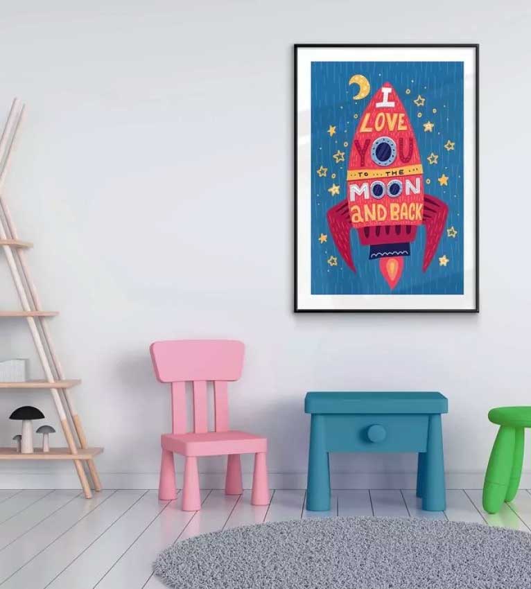 Färgglad barntavla med kärleksbudskapet på engelska ”I love you to the moon and back” som på svenska betyder ”Jag älskar dig till månen och tillbaka”. En unik affisch med vita kanter som passar snyggt att ramas in bland andra kärleksfulla bilder och glädjande barntavlor med kärleksförklaringar.