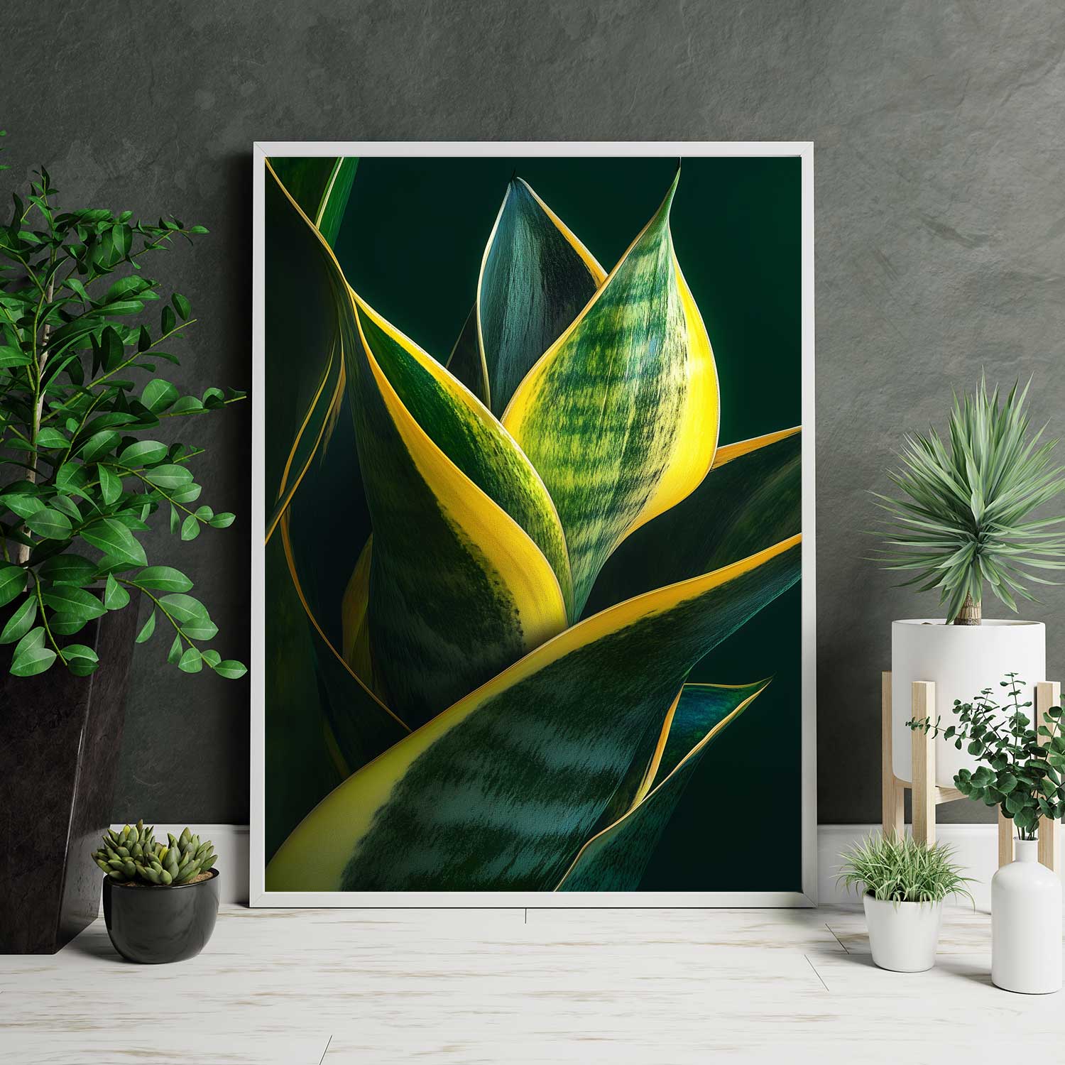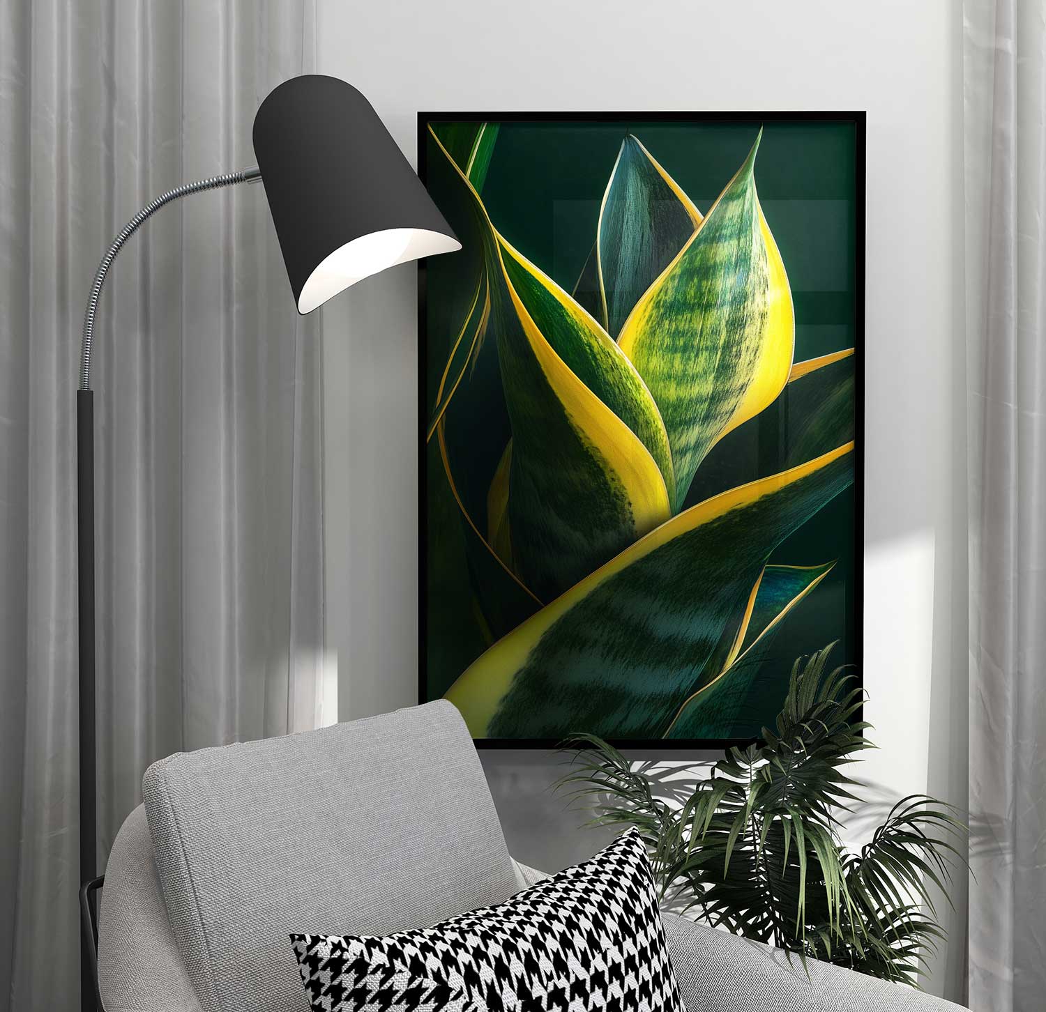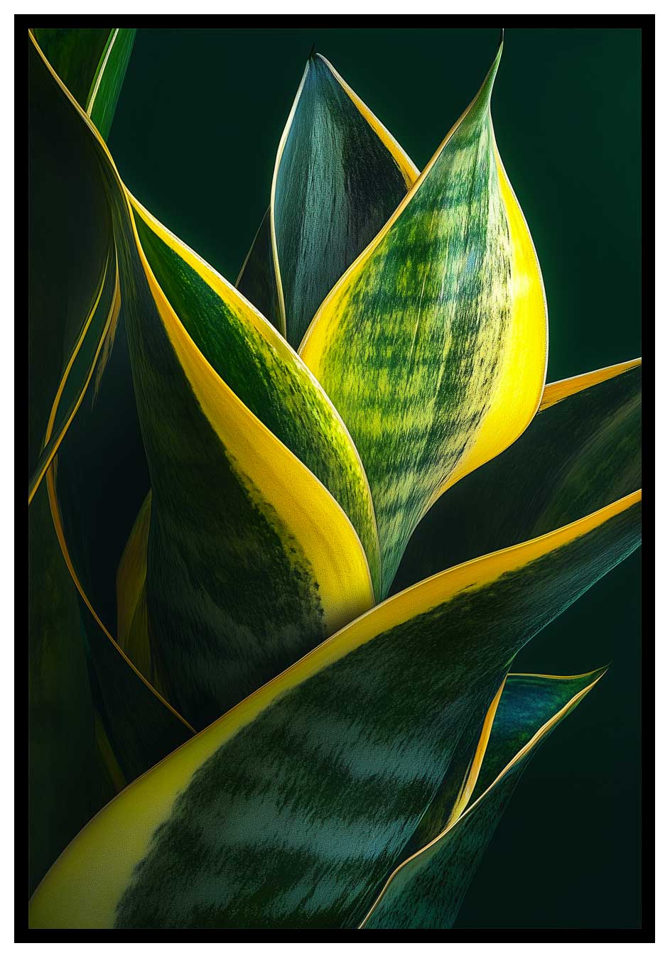 Den här postern tar avstamp i svärmorstungans karakteristiska blad, men presenterar växten på ett mer konstnärligt och abstrakt sätt. De långsmala formerna sträcker sig genom bilden och skapar ett rytmiskt mönster där bladens linjer nästan känns grafiska. Resultatet är ett motiv som känns både naturligt och modernt på samma gång.