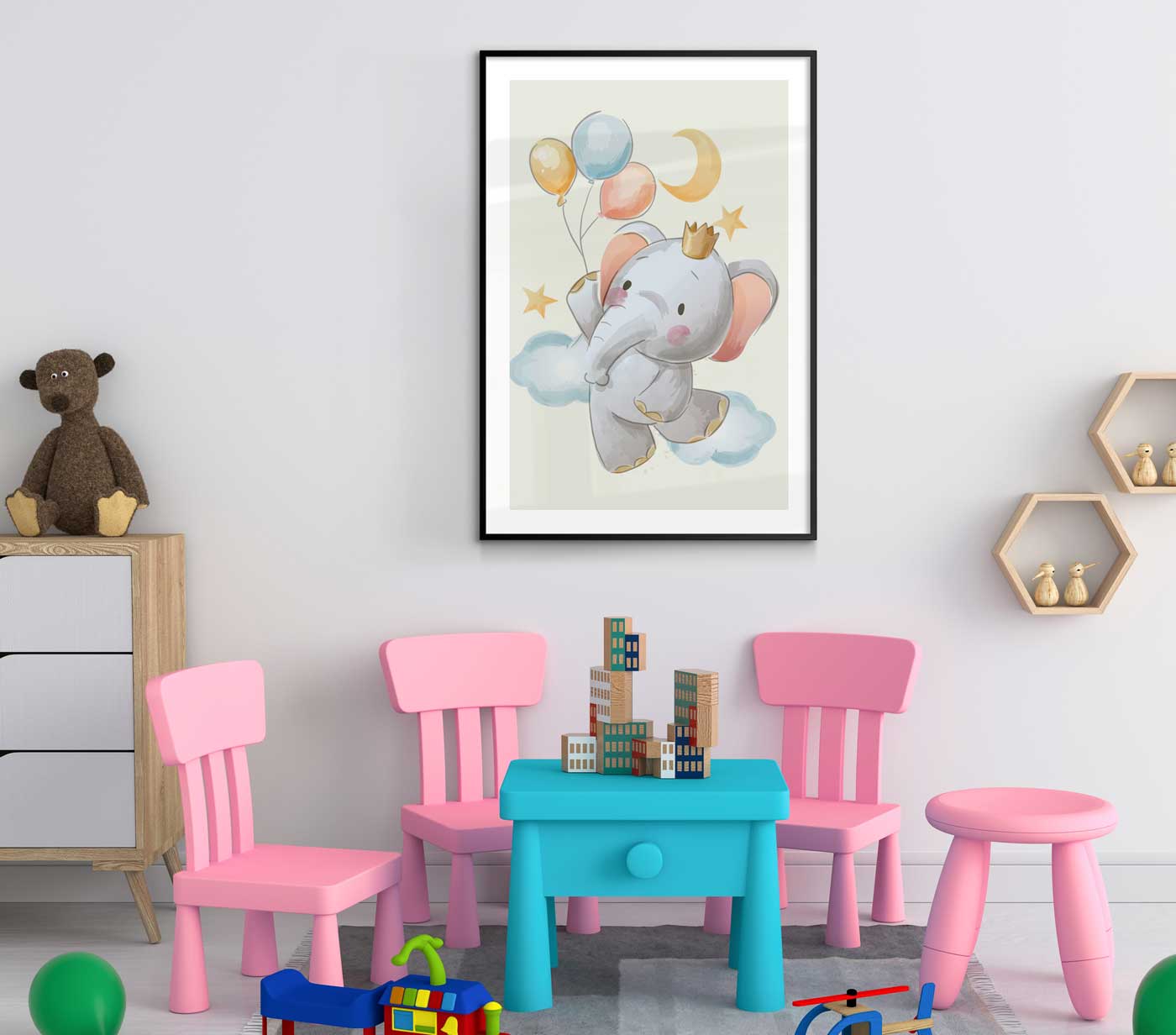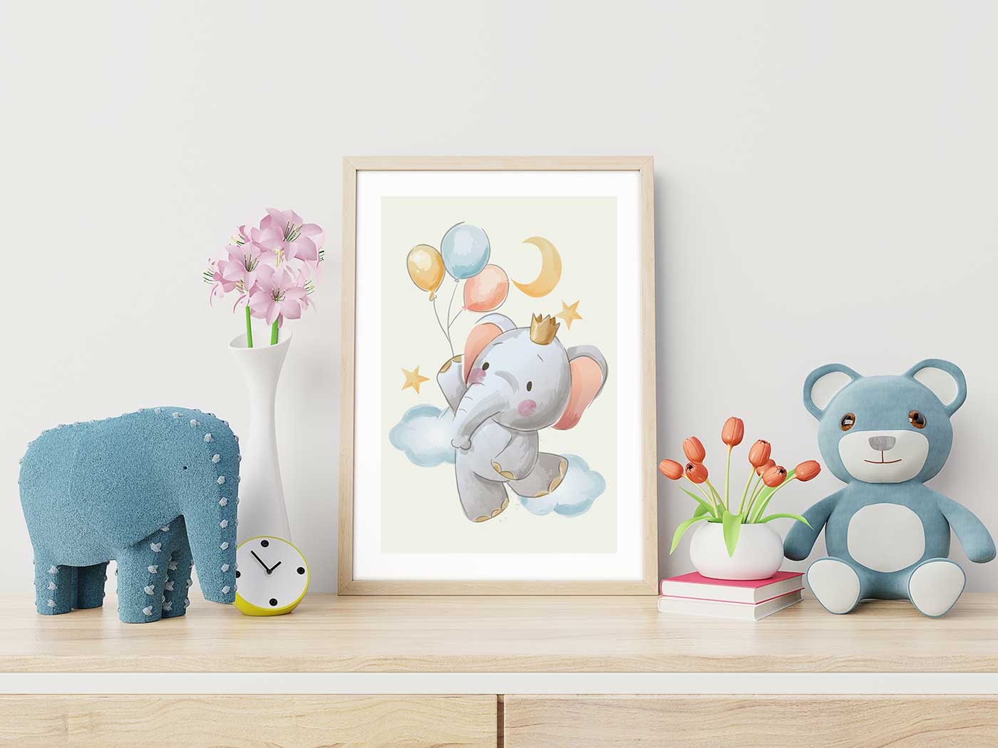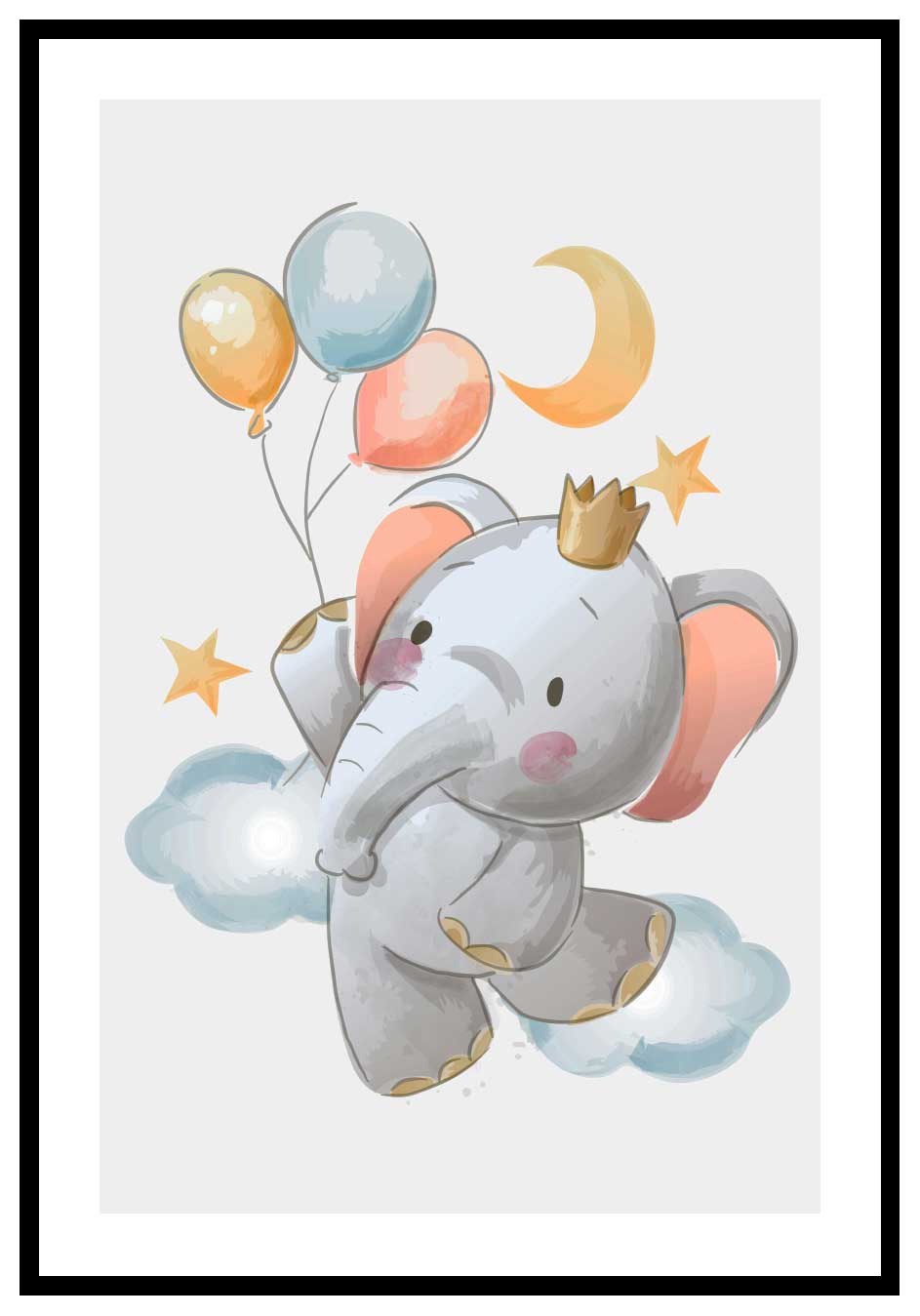En affisch till babyrum och barnrum med tecknat motiv på en söt elefant med kungakrona och rosa kinder som flyger i skyn bland moln, stjärnor och månen, med hjälp av sina färgglada ballonger. Affischen är försedd med vita kanter runtom bilden. Bilden passar utmärkt att ramas in bland andra barntavlor och söta tecknade djurbilder.