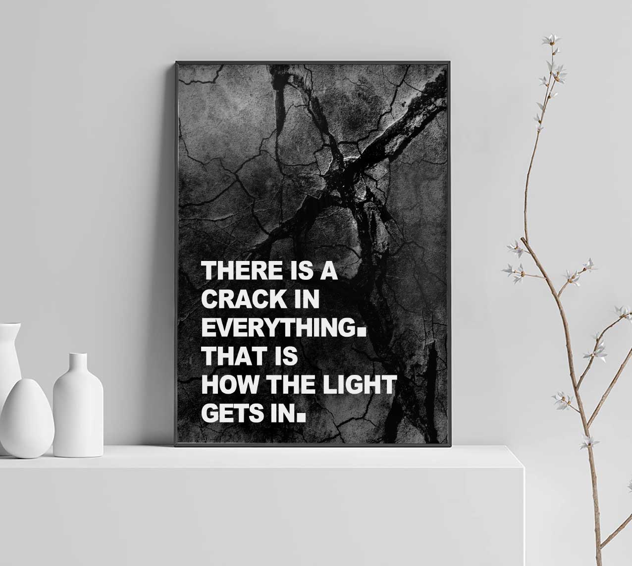 Snygg och trendig poster med upplyftande och styrkande text-citat. Texten lyder ”There is a crack in everything. That is how the light gets in.” vilket kan tolkas som att det är ok att inte vara perfekt. Affischen matchar med andra snygga svartvita posters och kan ramas in bland annan fotokonst i gråskala och motiverande textposters.