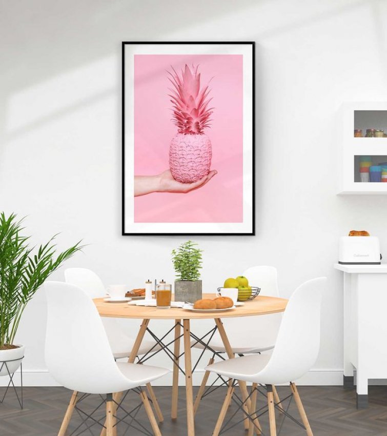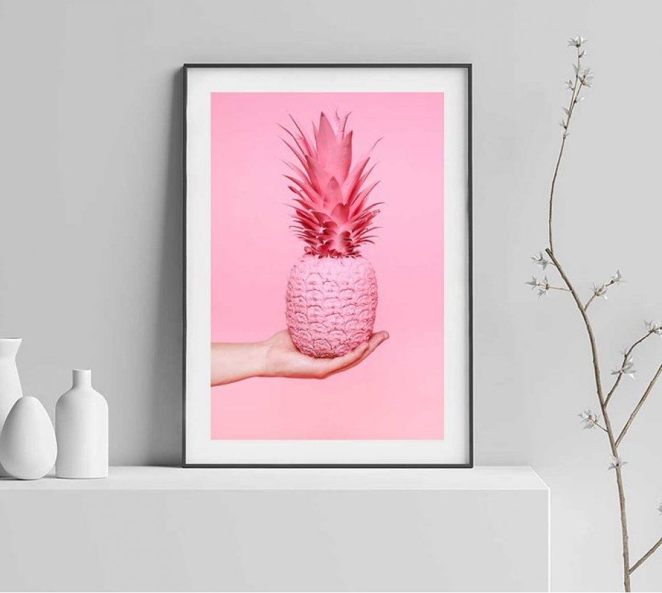 Rosa poster med trendigt fotografi på en hand som håller en ananas målad helt rosa. Affischen har en ”inbyggd” passepartout som framhäver den lyxiga delen av bilden. Postern passar snyggt som inramad fotokonst i köket men också som trendig väggdekoration i flickrummet.