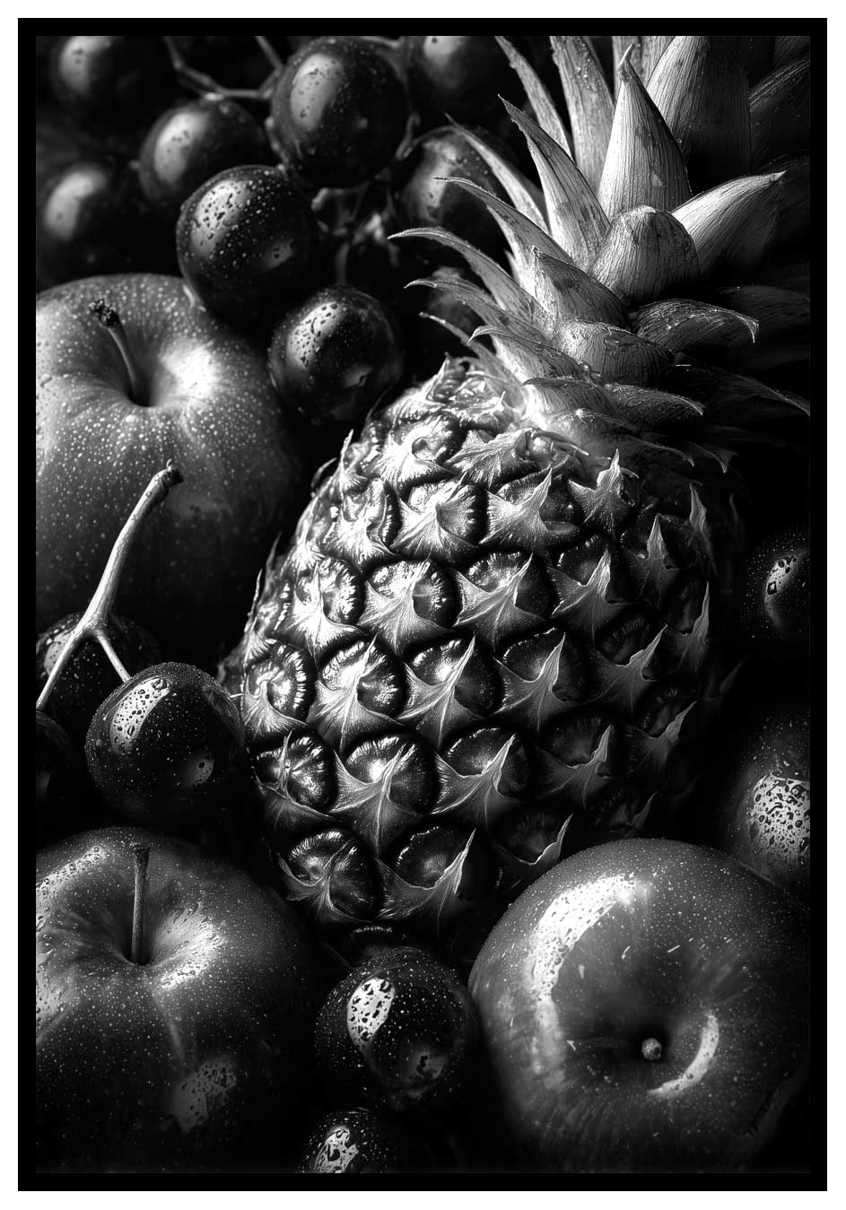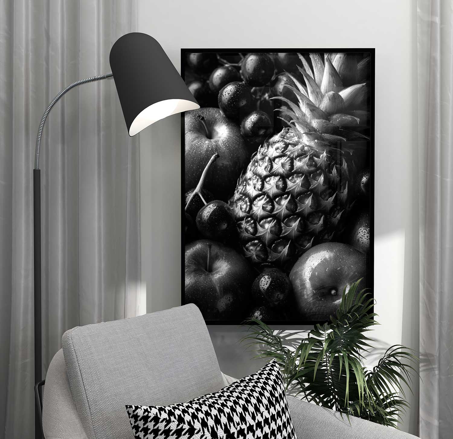 Ge ditt hem ett lyxigt lyft med denna sofistikerade svartvita poster där en ananas står i dramatisk närbild, elegant omgiven av äpplen och bär mot en mörk, djup bakgrund. De kraftfulla kontrasterna och de finstämda detaljerna framhäver frukternas struktur och skapar ett exklusivt, konstnärligt uttryck som känns både modernt och tidlöst.